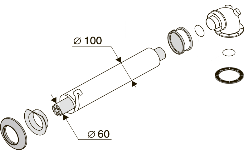 Коаксиальный дымоход для горизонтального прохода через стену. Длина 750 мм. |